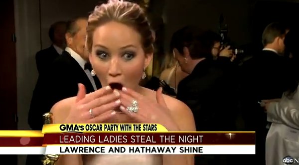 “Te iba a preguntar cuál fue el mejor momento de la noche”, comentó el entrevistador y Jennifer Lawrence dijo “¡Ese!”, sin parar de reír.